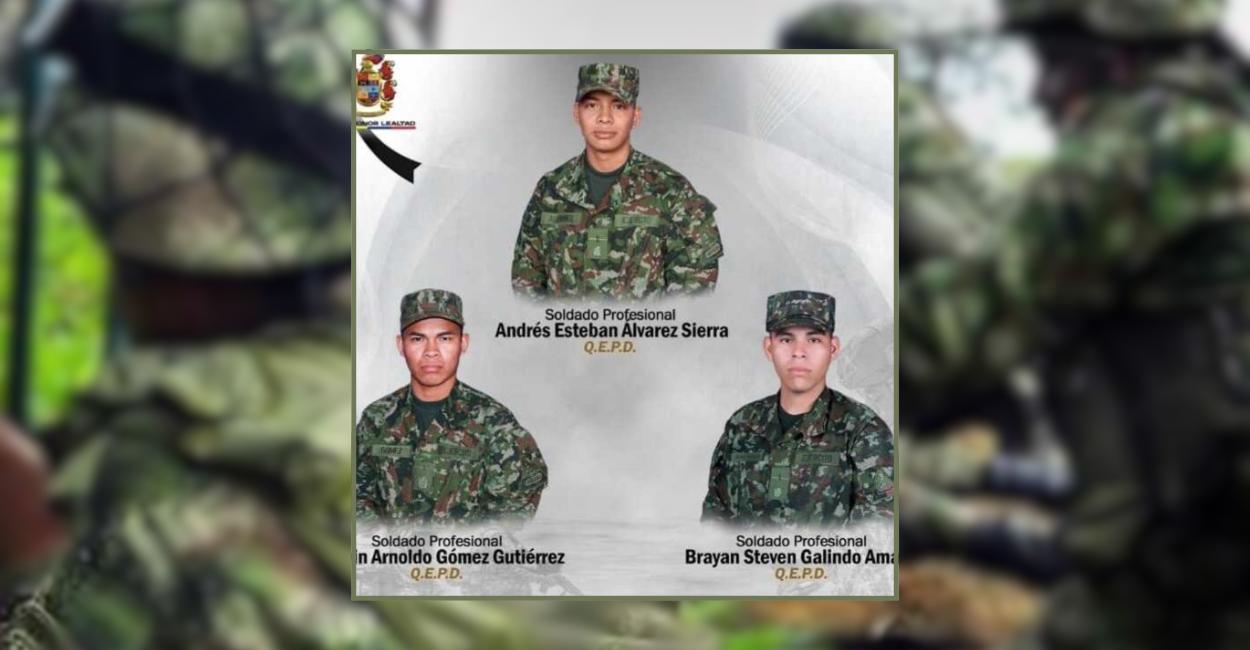 De acuerdo con el Ejército Nacional, las víctimas fueron identificadas como Andrés Esteban Álvarez Sierra, Darwin Arnoldo Gómez Gutiérrez y Brayan Steven Galindo Amado. En el mismo hecho, otros dos uniformados resultaron heridos y fueron atendidos en el lugar por enfermeros de combate, mientras se coordina su traslado a un centro médico en Pasto.