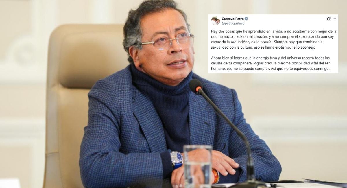 “Aprendí dos cosas en la vida: a no acostarme con una mujer de la que no nazca nada en mi corazón y a no comprar sexo cuando aún soy capaz de la seducción y la poesía. La sexualidad debe ir unida a la cultura; eso se llama erotismo”, escribió Petro en X, en respuesta a las críticas por el gasto reportado en dicho establecimiento.