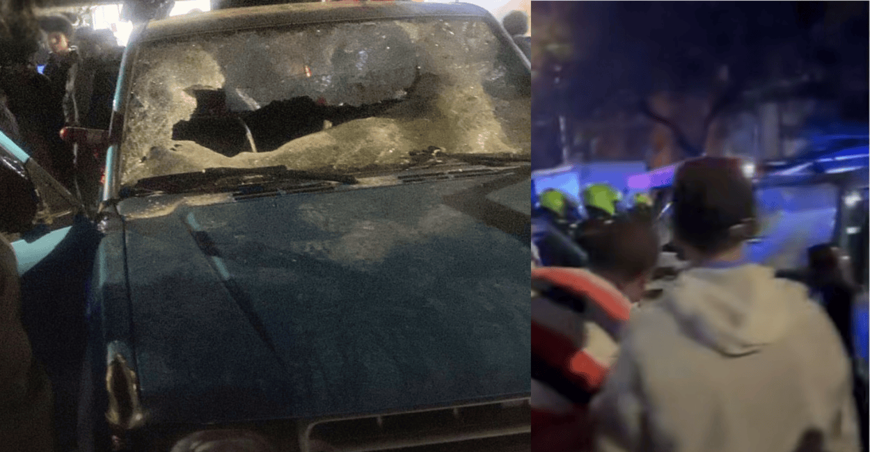 Videos que circulan en redes sociales muestran los graves destrozos del campero, el cual terminó con los vidrios rotos y severos daños estructurales tras la agresión.