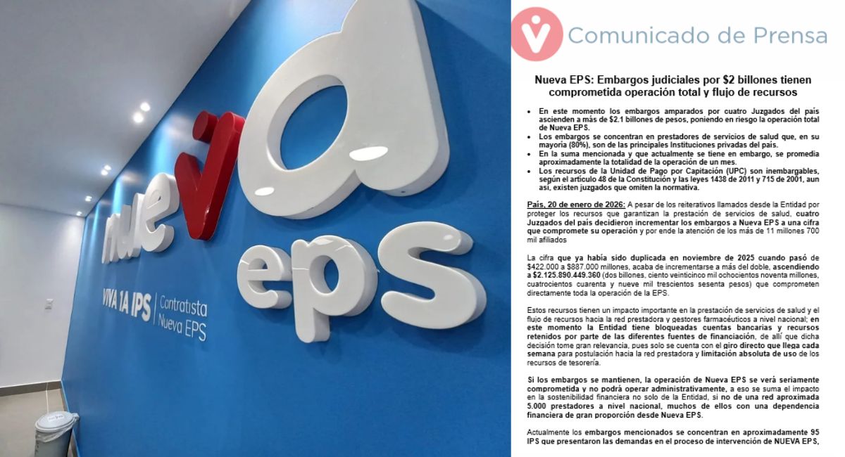 Nueva EPS advirtió que su operación y el flujo de recursos para la prestación de servicios de salud se encuentran gravemente comprometidos debido a embargos judiciales que superan los $2,1 billones de pesos, ordenados por cuatro juzgados del país.