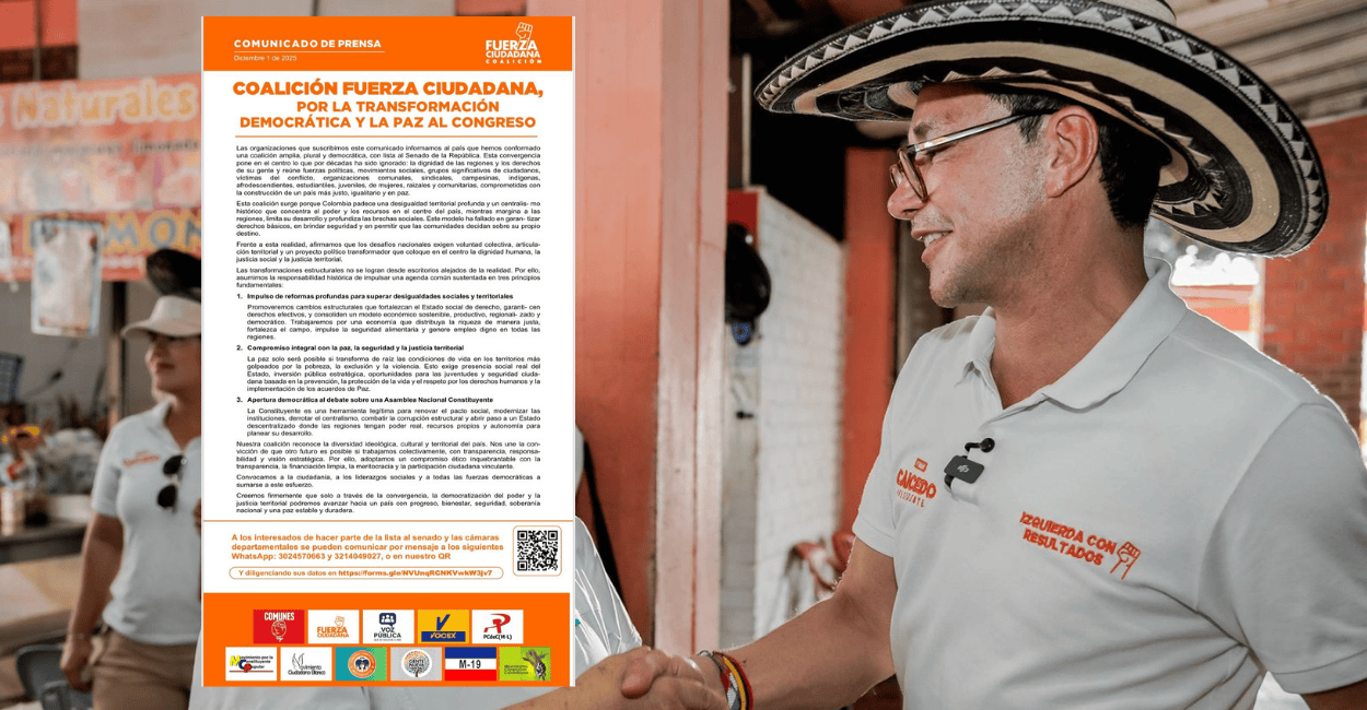 Carlos Caicedo, líder de Fuerza Ciudadana, celebró el acuerdo a través de redes sociales, calificándola como “una coalición amplia, plural y profundamente regional”.