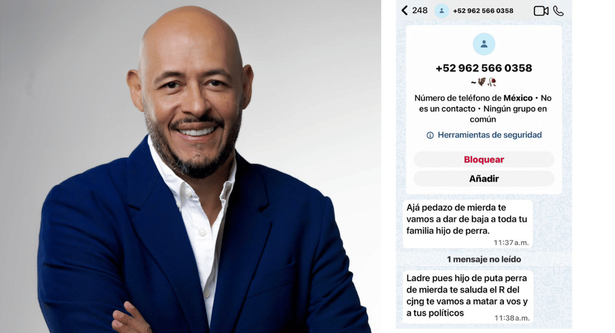 Según conoció Seguimiento.co, el mensaje fue recibido ayer domingo hacia las 11:30 de la mañana desde el número +52 962 566 0358. En el texto, el remitente utilizó lenguaje violento y amenazas directas, afirmando —entre otras expresiones— que “le darían de baja” a él y a su familia, y asegurando que lo iban a matar junto a “sus políticos”.