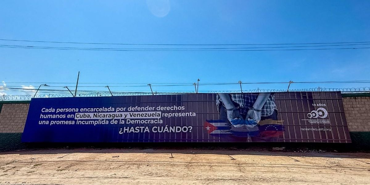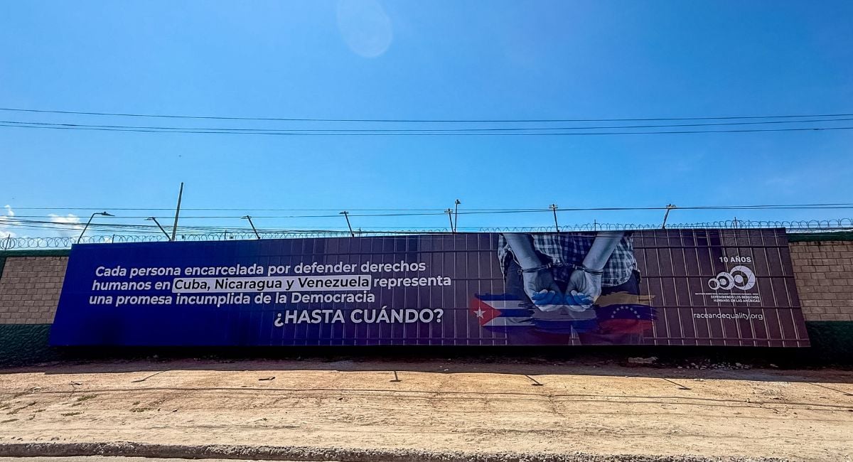 La valla llevaba el mensaje: “Cada persona encarcelada por defender los derechos humanos en Cuba, Nicaragua y Venezuela representa una promesa incumplida de la democracia. ¿Hasta cuándo?”