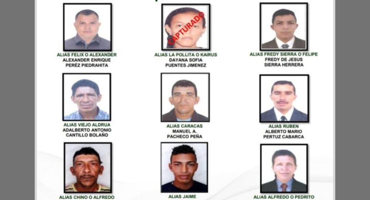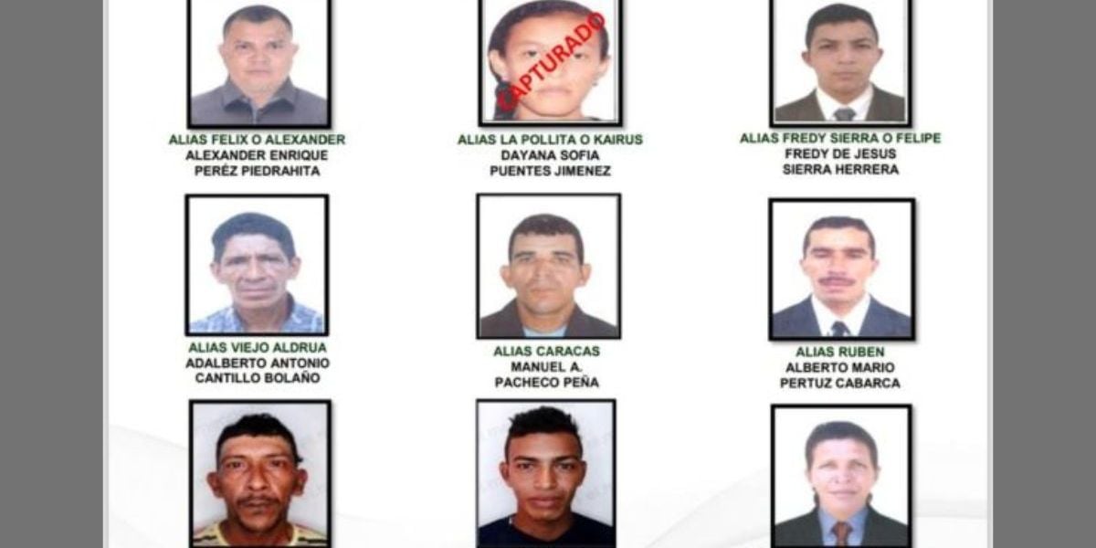 En el afiche figura Alexander Enrique Pérez Piedrahita, alias ‘Félix’ o ‘Alexander’; Dayana Sofía Puentes Jiménez, alias ‘La Pollita’ o ‘Kairus’ quien aparece reportada como capturada; Fredy de Jesús Sierra Herrera, alias ‘Fredy Sierra’ o ‘Felipe’; Adalberto Antonio Cantillo Bolaño, alias ‘Viejo Aldrua’ y Manuel A. Pacheco Peña, alias ‘Caracas’.