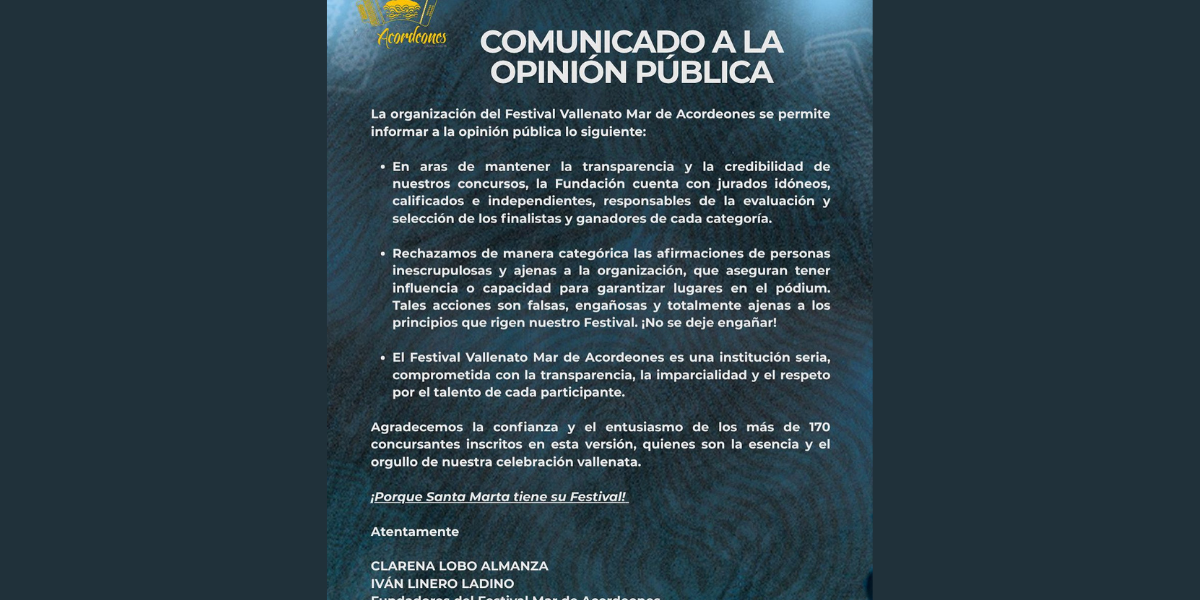 La Fundación del Festival Vallenato Mar de Acordeones de Santa Marta emitió un comunicado a la opinión pública para salir de los rumores que buscaban socavar la credibilidad de sus concursos de talento.