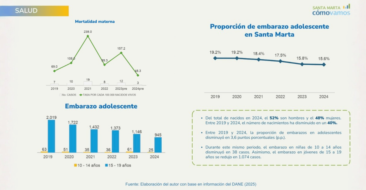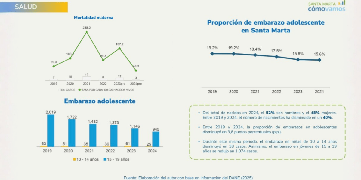 El informe, elaborado por Santa Marta Cómo Vamos, confirma una tendencia a la baja en el embarazo adolescente. La proporción de nacimientos de madres adolescentes (entre 10 y 19 años) se redujo significativamente: