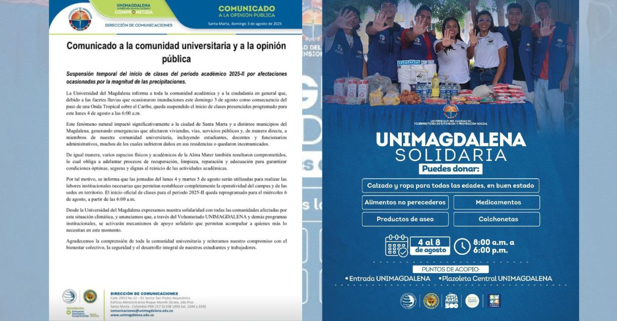 La Universidad del Magdalena anunció la suspensión temporal del inicio de clases presenciales correspondientes al periodo académico 2025-II, debido a las afectaciones ocasionadas por las fuertes lluvias registradas este domingo 3 de agosto en Santa Marta y municipios del Magdalena.