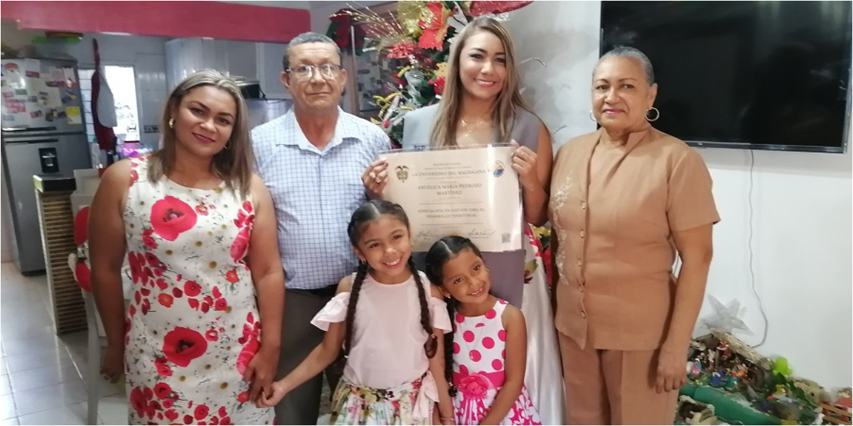 En este sentido, Angélica Pedrozo Martínez, quien es economista egresada de la institución, participó de la jornada en compañía de sus padres, su hija y su hermana, en la que con diploma en mano y la estola alrededor de su cuello, se certificó oficialmente como Especialista en Gestión del Desarrollo Territorial.