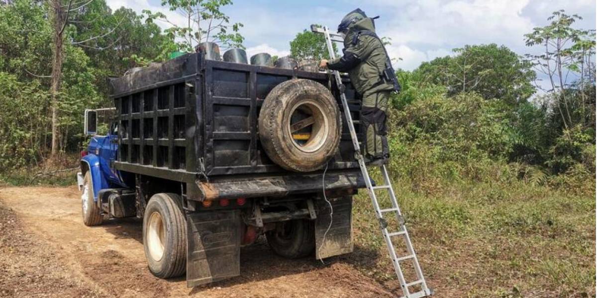 Unidades antiexplosivos de la Policía, en conjunto con el Ejército, neutralizaron una volqueta cargada de explosivos en jurisdicción del corregimiento de Campo Dos, zona rural de Tibú, Norte de Santander.