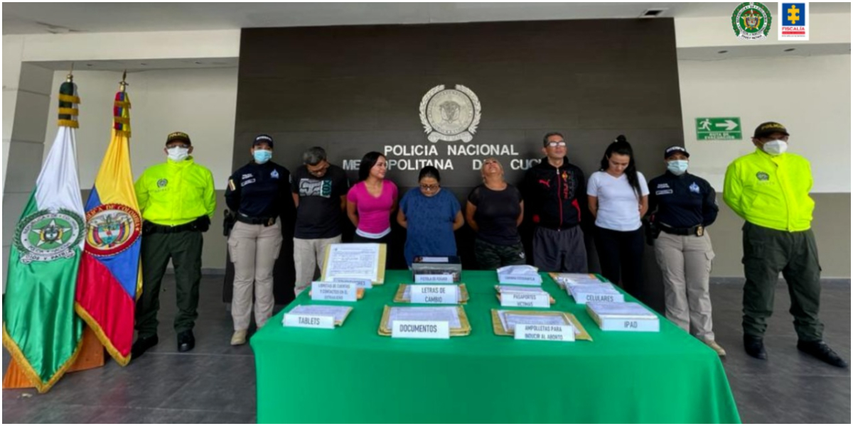 Este clan familiar fue capturado en diligencias realizadas de manera conjunta por la Fiscalía y la Dijin – Interpol de la Policía Nacional en Cúcuta. En los procedimientos fueron incautados documentos, pasaportes y cédulas de ciudadanía de mujeres, un arma de fogueo y medicamentos para la terminación anticipada del embarazo, entre otros elementos.