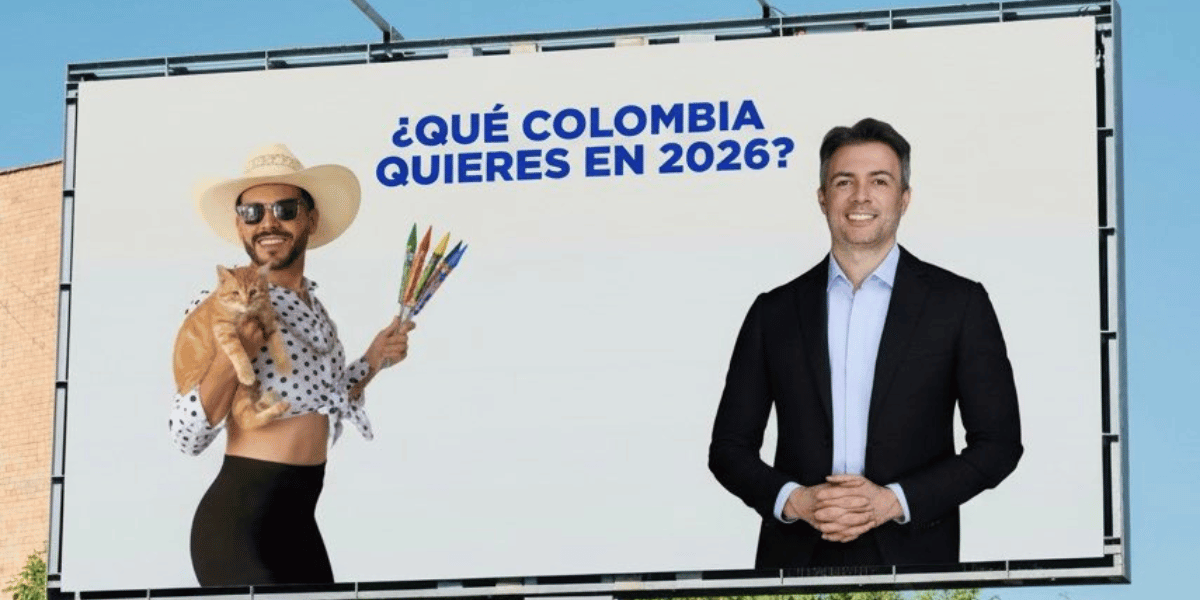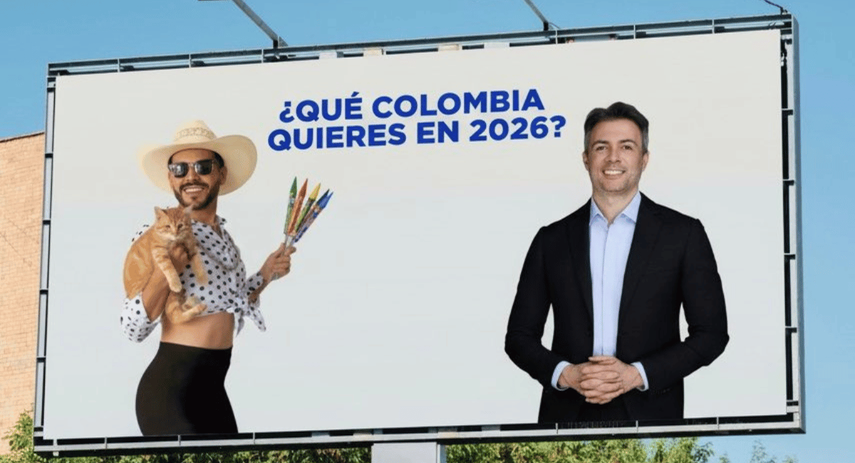 En la imagen se observa una valla publicitaria alterada digitalmente. En esta aparece De la Espriella vestido con una blusa corta, acompañado de un gato y sosteniendo objetos coloridos en una mano. Quintero, en cambio, aparece sin modificaciones.