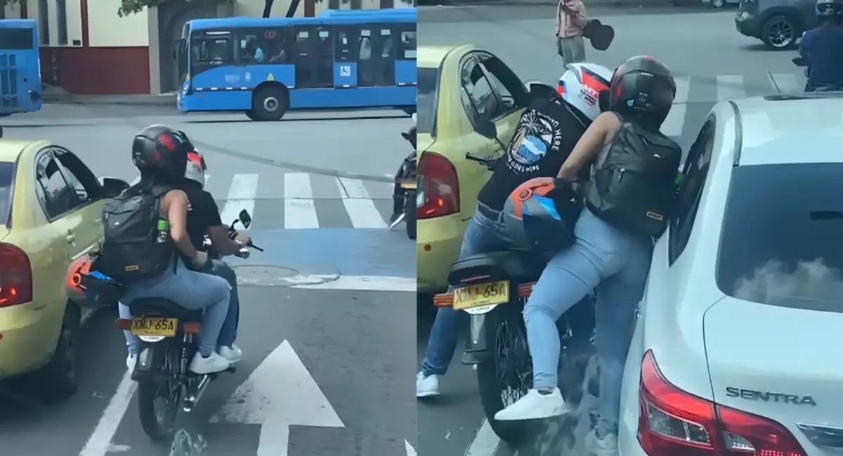 En un video grabado desde otro vehículo quedó registrado el momento exacto en que una pareja intenta asaltar al conductor de un carro Nissan Sentra blanco mientras se encontraba detenido en un semáforo, en el sector de San Bosco, centro de Cali.