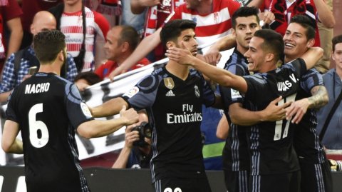 El equipo blanco tardó un suspiro en ponerse por delante en el marcador, ya que a los dos minutos y medio de partido James remachó en línea de gol un tiro que por sí mismo entraba de Lucas Vázquez, que ganó la espalda sin problemas a la zaga local.