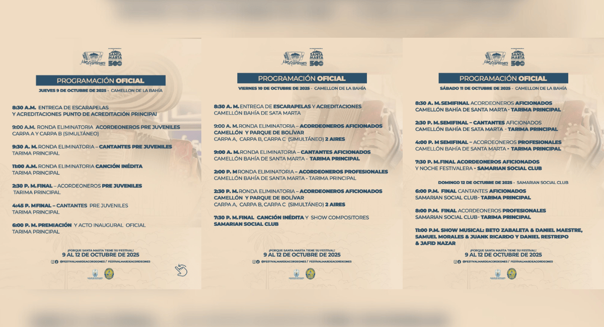 El Festival Vallenato Mar de Acordeones llega a su edición número 29 con una agenda que reunirá durante cuatro días el talento de acordeoneros, cantantes y compositores de diferentes regiones del país. El evento se desarrollará del 9 al 12 de octubre de 2025 en distintos escenarios de Santa Marta, como el Camellón de la Bahía, el Parque de Bolívar y el Samarian Social Club.