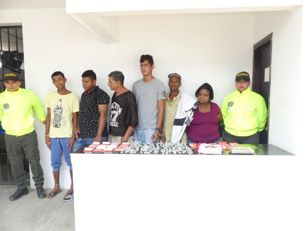 Los capturados son Álvaro Gómez Hernández, alias ‘Mogolla’; Luis Antonio Luna Pérez, alias ‘Toño’; María del Carmen Franco Blanco, alias ‘La Negra’; Gian Carlos Castro Pérez, Deivis David García Llanes y Javier Enrique Gamarra Cantillo, alias ‘Mante’, quienes tenían órdenes de capturas emanadas del Juzgado Tercero Penal Municipal y la Fiscalía 15 de Santa Marta por el delito de tráfico, fabricación y porte de estupefacientes.
