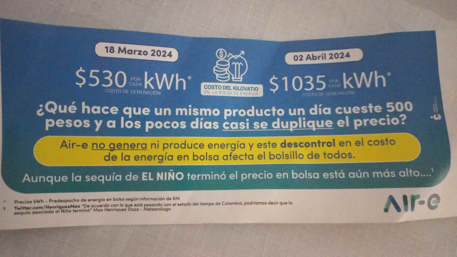 "Air-e no genera ni produce energía, y este descontrol en el costo de la energía en la bolsa afecta el bolsillo de todos", justificó, por su parte, Air-e en el recibo que envió a los usuarios.
