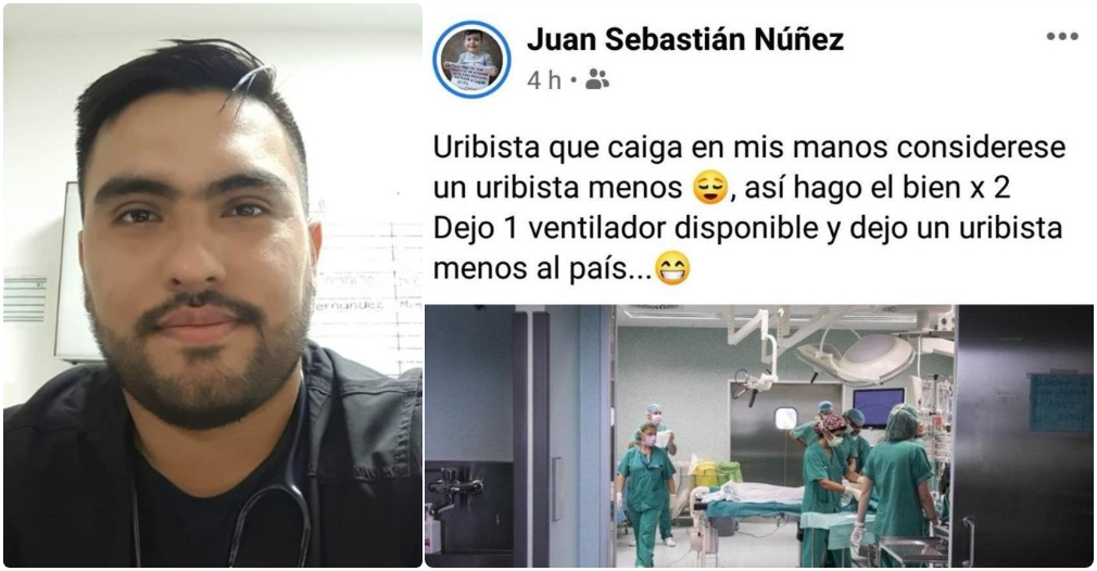 • Este es Juan Sebastián Núñez, médico de urgencias de la clínica General del Norte en Santa Marta, el mismo que publicó en Facebook que iba a dejar morir los uribistas enfermos por covid-19, quitándoles respirador.