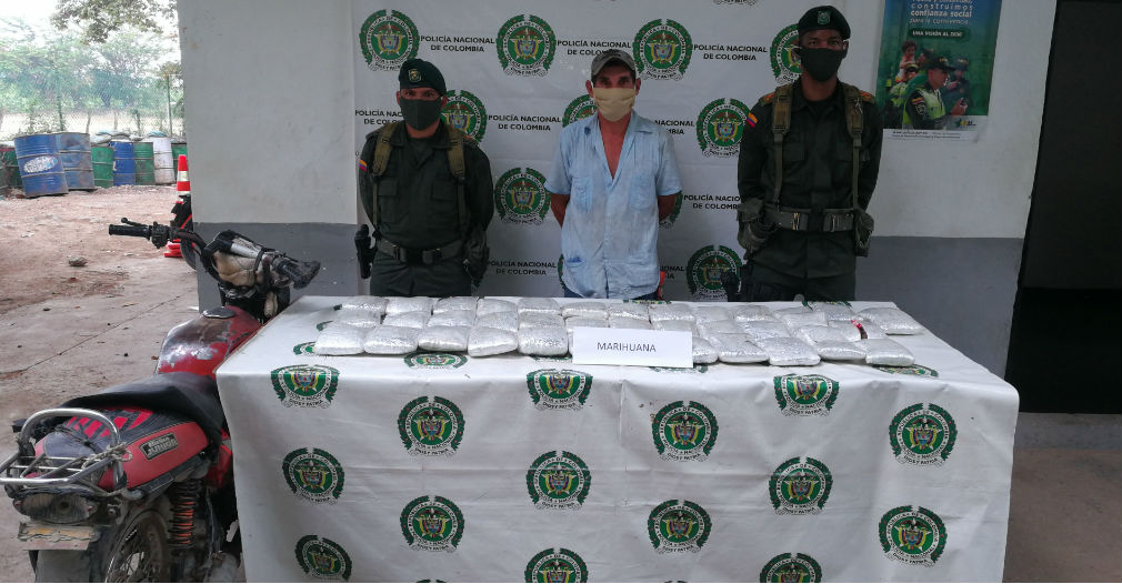 “Santana Ballena conducía una motocicleta llevando un costal de fique. cuando se desplazaba por el corregimiento de Tucurinca fue abordado por uniformados, quienes al requisarlo le hallaron 37 paquetes envueltos en papel aluminio que contenían marihuana, con un peso total de 18.500 gramos, que iban ocultos con bananos”, indicó la Policía en un comunicado.