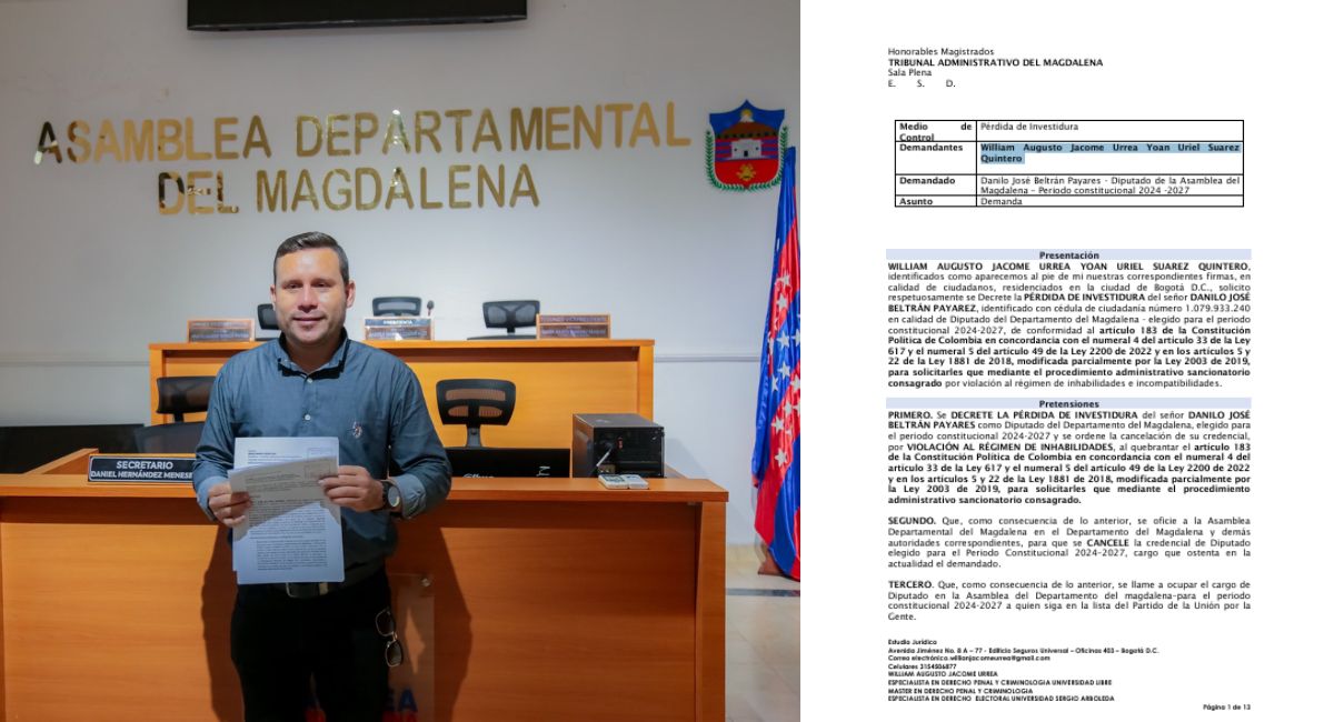 Y es que ante el Tribunal Administrativo del Magdalena, llegó la demanda interpuesta por William Augusto Jacome Urrea y Yoan Uriel Suarez Quintero, pidiendo la pérdida de investidura del nuevo diputado de Fuerza Ciudadana.