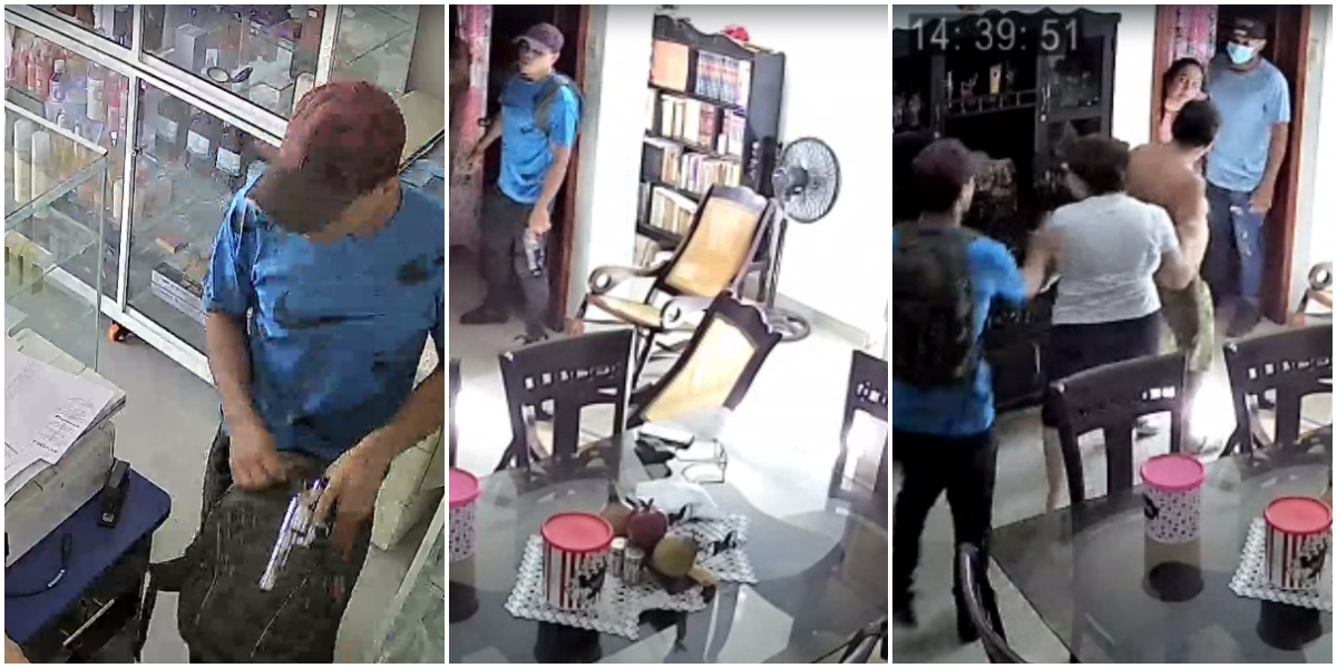 En imágenes grabadas por cámaras de seguridad del negocio se ve cuando estas personas, fuerzan a los encargados del negocio, que son personas de edad avanzada, a ingresar a la vivienda, que está conectada con la miscelánea.