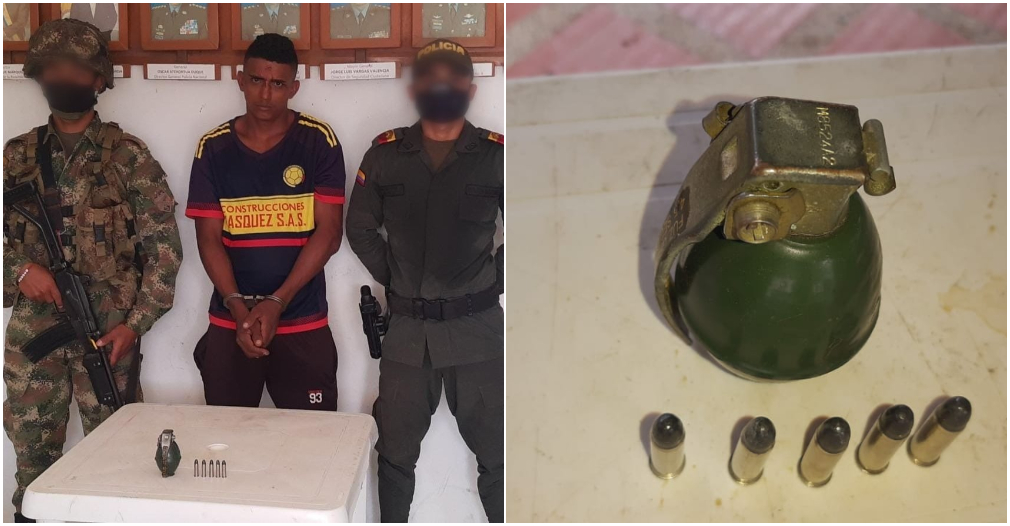El cuadrante de la Policía con el apoyo del Ejército Nacional se desplazó hasta el lugar y capturaron a Polo Tamara, a quien le hallaron en su poder una granada de fragmentación IM-26 y cinco cartuchos calibre 38, por lo que de inmediato fue judicializado ante las autoridades competentes, para que responda por el delito de fabricación, trafico, porte o tenencia de armas de fuego, accesorios, partes o municiones.