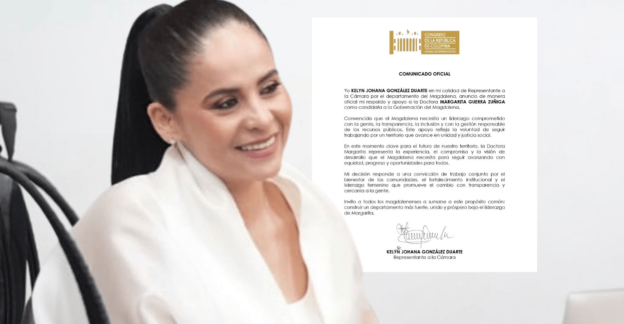 Mediante un comunicado oficial, Kelyn González Duarte, representante a la Cámara por el departamento del Magdalena, anunció públicamente su respaldo y apoyo a Margarita Guerra Zúñiga como candidata a la Gobernación.