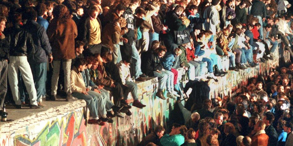 Jóvenes sobre el Muro de Berlín.
