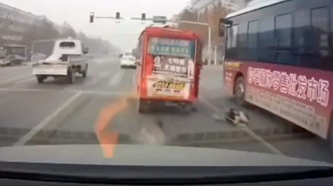 En video quedó registrado un angustioso momento que pudo terminar en tragedia. Un niño cayó desde un vehículo en las calles de Báoding en China, y un bus paso a pocos centímetros de su cabeza.