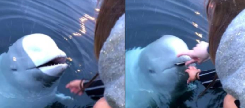 El hecho fue captado en video, y se observa al animal, que según los expertos es una ballena beluga, que sale hasta la superficie con el teléfono en su boca, que fue recibido por una persona y luego la ballena fue acariciada.